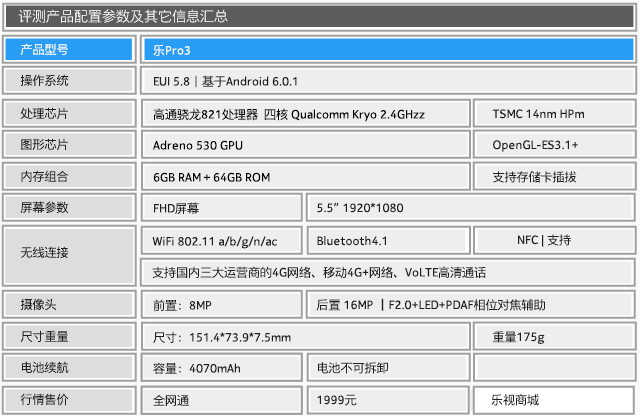评测之前依然先来看一下测评机型的配置,乐Pro3采用全金属机身,5.5英寸的1080P分辨率全贴合(In-Cell)屏幕,搭载骁龙821处理器(单核速度可达2.35GHz),配备4GB/6GB运行内存,存储空间为32GB/64GB/128GB(UFS2.0),后置1600万像素和前置800万像素的摄像头组合,内置4070mAh的电池,支持2.4G/5G双频WLAN、指纹识别、全网通、VoLTE高清通话、全功能NFC、CDLA标准、红外遥控器等,预装基于Android 6.0.1的EUI 5.8操作系统。