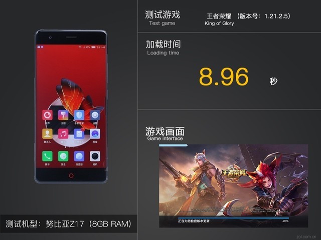 《王者荣耀》加载速度测试结果 易上手的机制以及激烈的排位模式使得《王者荣耀》成为现如今十分火爆的手游,在这项游戏的加载测试中,努比亚Z17 8GB版获得8.96秒的成绩,笔者在测试过程中,可以明显感受到骁龙835移动平台畅快的运行速率。