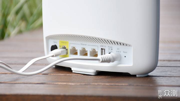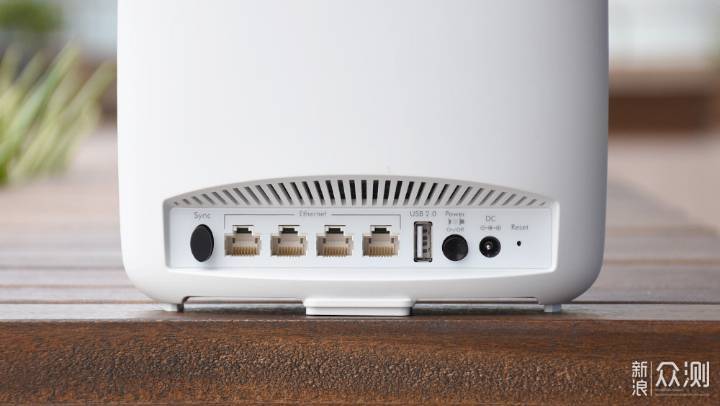 机身的按钮和接口全部规整到背部靠下的凹槽区域,极大地提高了产品正面的美观程度。主机从左到右依次为Sync按钮、Internet网线接口(WAN)、三个Ethernet网线接口(LAN)、USB 2.0、电源键、DC电源接口以及Reset复位软键。副机与主机稍有不同,去掉了Internet网线接口,改为四个Ethernet网线接口,由此也不难看出两台设备在功能性方面是有所区分的。需要注意的是,网件RBK50的网线接口并非全兼容接口,在使用时需要注意区分。