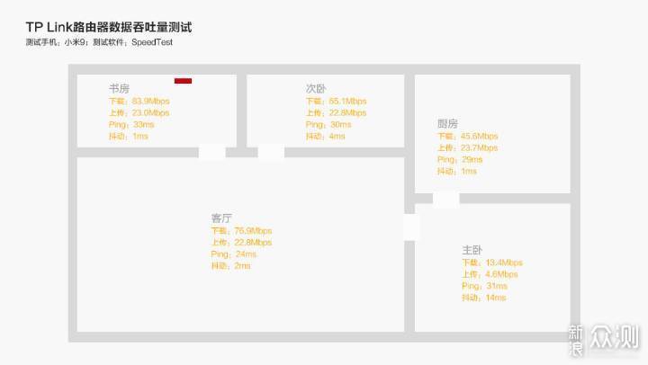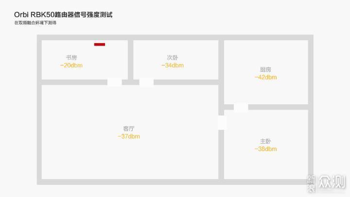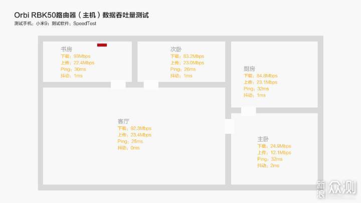 接着分享RBK50路由器主机在全屋不同房间的数据吞吐量数据,由于Orbi RBK50默认是双频合一且不支持单独频段开启,故以上测试数据均在按照路由器自动分配的频段下测得。众所周知,2.4Ghz无线频段在信号强度方面要优于5Ghz,但在网络速率方面则会稍显逊色,不过手头设备也无法甄别具体接入的频段,因此只能通过测试数据进行分析。