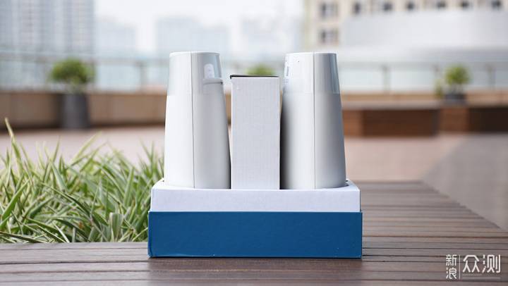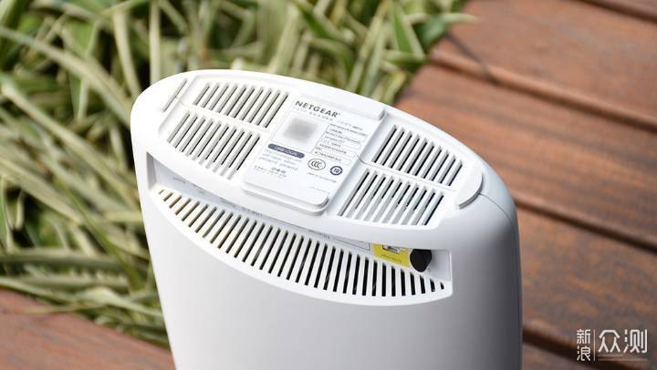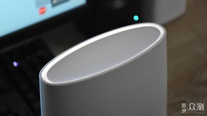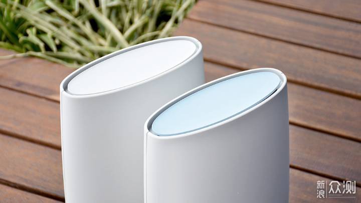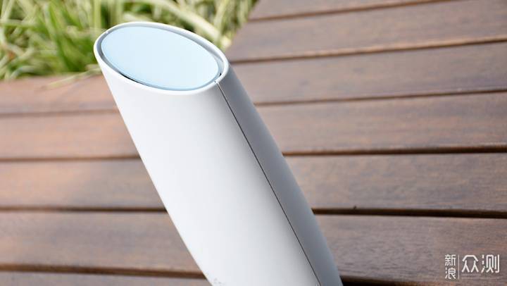 主副两台路由器在设计上并无太大差异,区分两台设备最直接的就是机身顶部的颜色,主机中间的挡板为浅蓝色,副机中间的挡板为白色,以此就可以直观的区分两台设备。这块挡板同时作为机身隐藏式指示灯来使用,在后面的体验环节会详细讲到。机身顶部的这条环形空隙起到辅助散热的作用,也就是所谓的“烟囱式”散热结构。