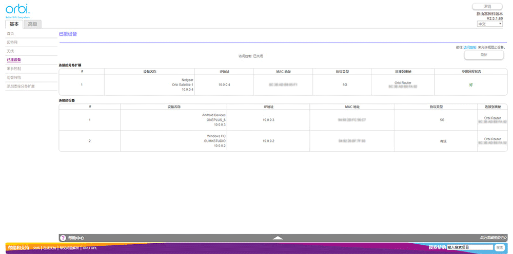 在路由器管理面板的“已接设备”中可以查看当前接入的副机的详细信息,包含设备名、IP地址、MAC地址、协议类型等等,可以看到以我目前的接入状态,主副机之间使用5Ghz频段的WiFi网络进行连接,并且回程状态良好。当然各位同学也可以根据实际的使用环境和需求,添加多台扩展副机来增强无线网络信号的覆盖强度。有别于传统Mesh路由器的一点在于,Orbi RBK50路由器摒弃了电力组网功能,选用了更加直接的网线或无线网络进行组网,在主副机之间开通了一条专用的5G 4通道回程信号频段,传输速率达到1733Mbps,网络传输顺畅覆盖范围更大。
