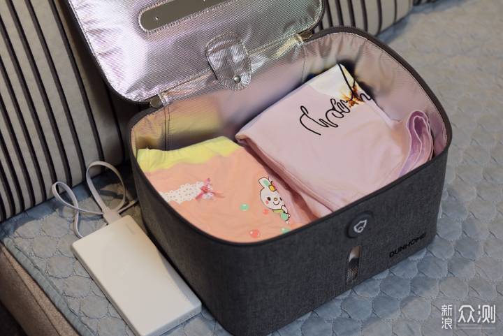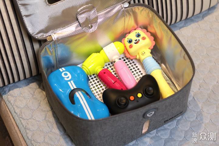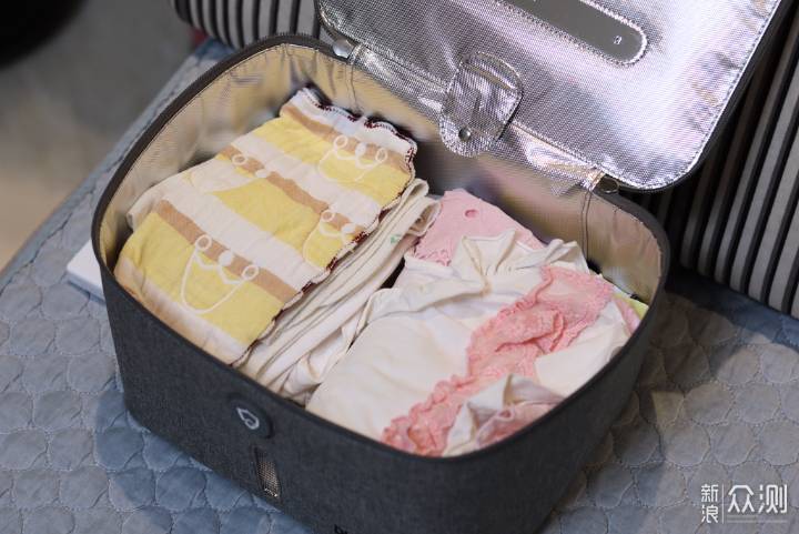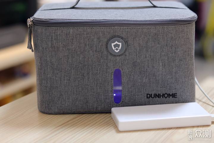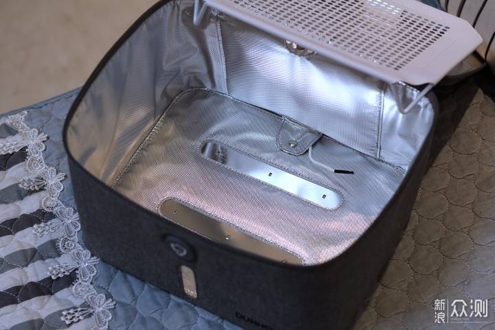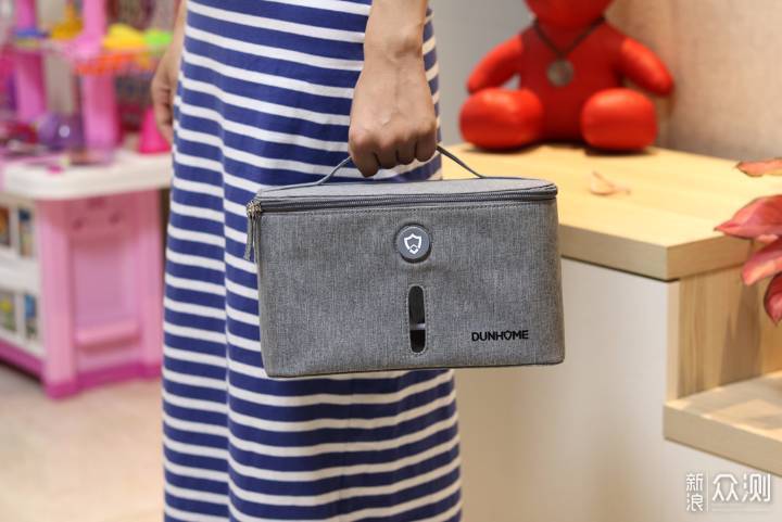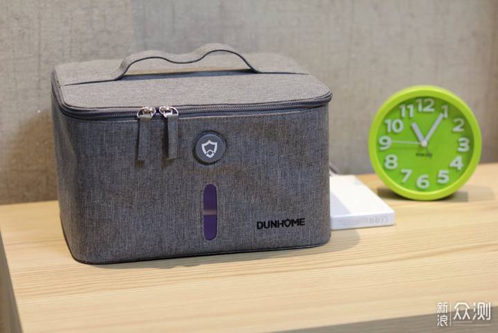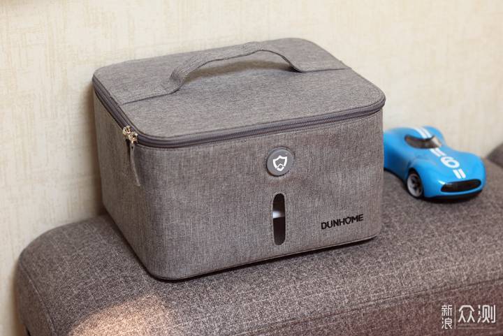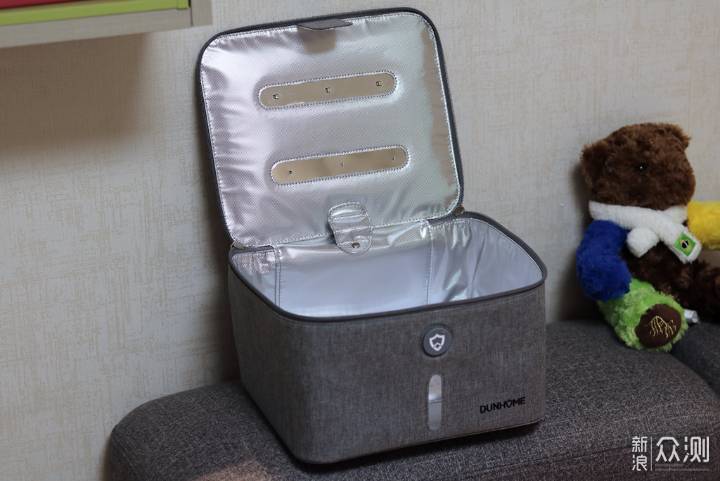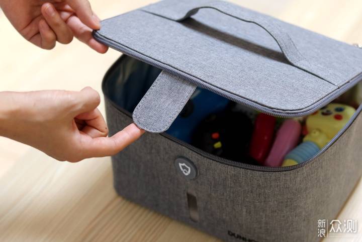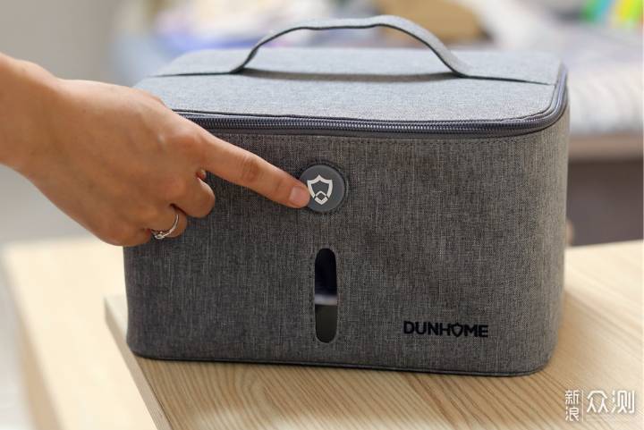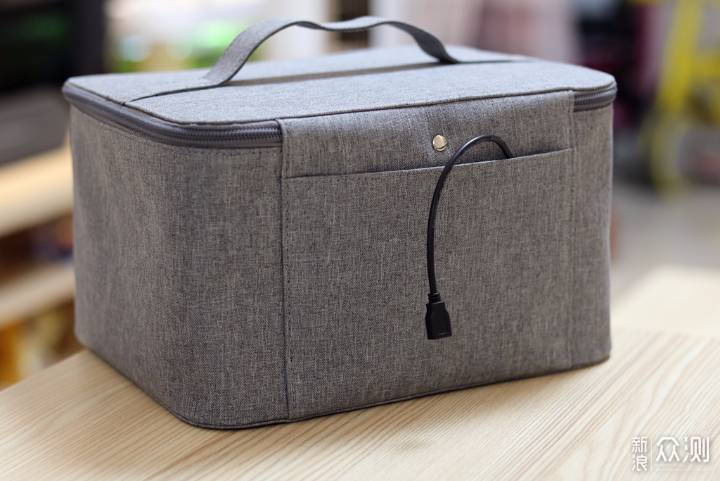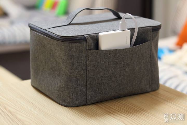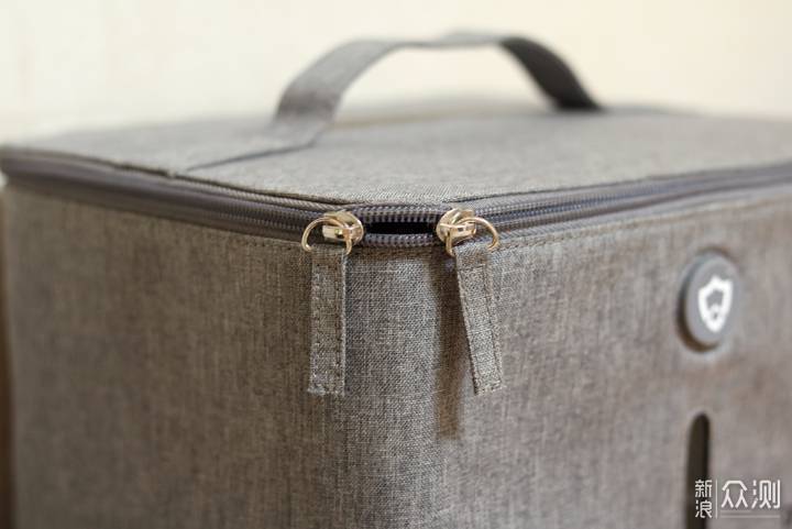 小睡这次拿到的是灰色款,整个消毒箱的体积不大,就像平时上班带饭的饭盒套一样大小。箱子表面通体采用涤纶布艺材质,做工还算是精细的,上面的车缝线清晰可见。消毒箱重600g,上面有一个提手,用户可以随提随放。