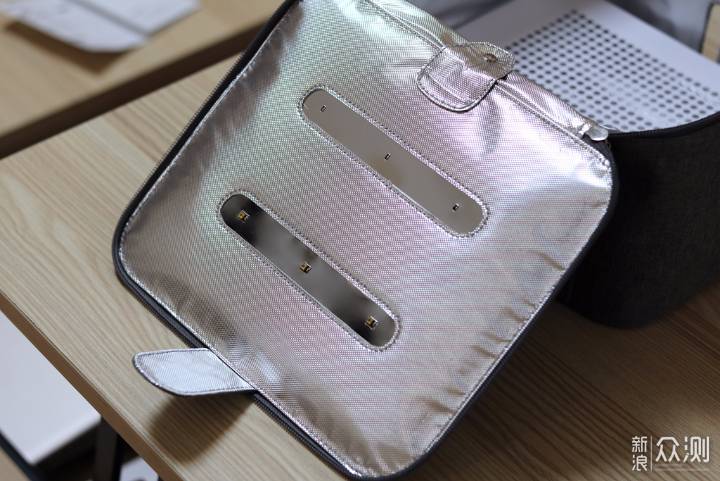 拉开拉链可以看到消毒箱里面的设计,主要是由灯条和铝箔片构成。小盾多功能消毒箱采用创新性UVCLED紫外消毒技术,箱子里面的18颗灯珠可以释放270nm-280nm波长的紫外线,功率7mW-10mW,经过周围铝泊片360°的反射,能够杀死居家物品上多种细菌,杀菌率达99.9%。