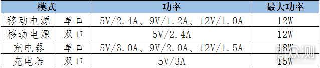 当开启移动电源模式,单口输出时支持5V/2.4A、9V/1.2A、12V/1.0A最高12W的快速充电,双口输出时最大 支持5V/2.4A最高12W的快速充电;当开启充电器模式,单口输出时支持支持5V/3.0A、9V/2.0A、12V/1.5A最高18W的快速充电,双口输出时最大 支持5V/3A最高15W的快速充电,整体而论,充电器模式的充电速度快于移动电源模式。