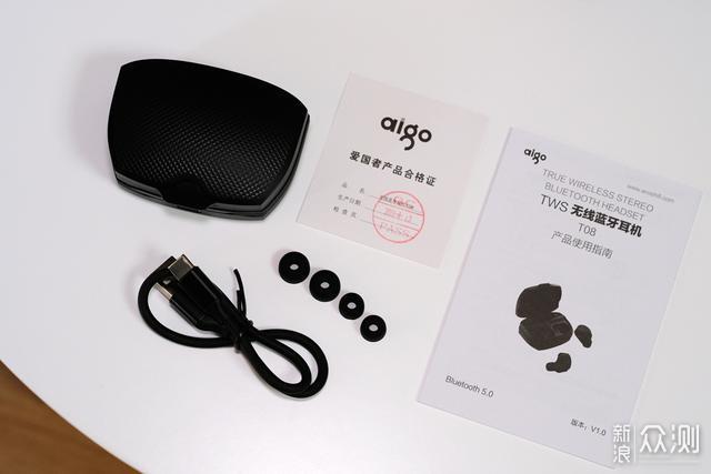 aigo T08的随机配件包括充电盒、两副尺寸不同的备用耳套、Tpye-C USB充电线、合格证和产品说明书。