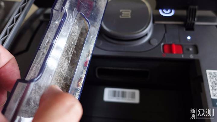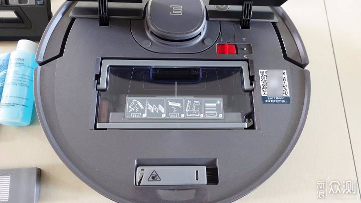 打开扫地机器人面盖,可以看到电源主开关(表面那个其实是启动暂停键),网络状态指示灯,尘盒,和一把清理专用的小刷子(带切割刃口)。