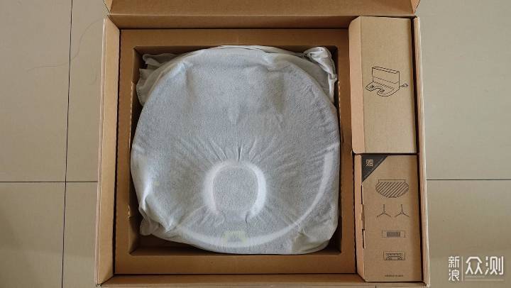 内包装中科沃斯扫地机器人被完好的包裹,右边和机器底层都是配件区,充电桩,清洁抹布,边刷一类都在这里。