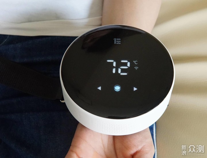 小艾2外观最醒目的就是正面这一块黑色OLED显示屏,采用了全触控式操作。直接在屏幕上实现所有设置:如开关、连接WiFi、温度设置等。虽说屏幕不算大,但是用来显示各种参数信息也是足够了,即使在光线较强的环境下也可以看得清楚。