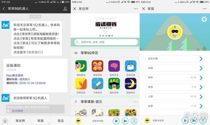 开机就有欢迎声音,需用扫描的机器人底部的微信二维码关注公众号“笨笨5Q机器人”,所有的资源都是通过微信号进行相关内容的上传,其中,菜单栏的“笨世界”里面就有很多免费资源,笨笨5Q专区、笨笨课堂-语文、笨笨-数学、笨笨-英语、精选推荐等。
