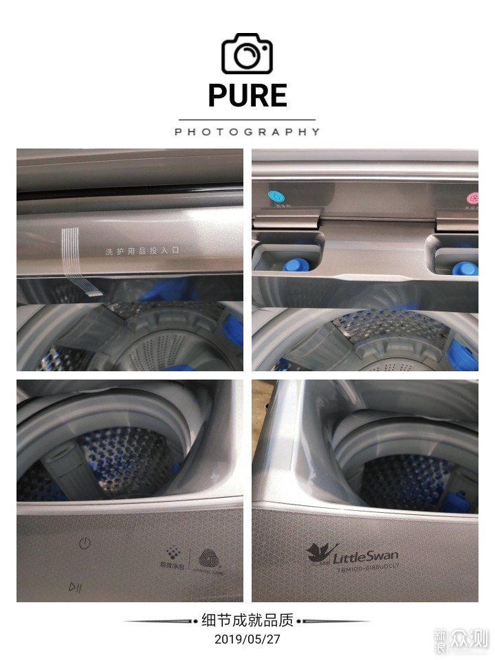 细节篇-细节成就品质洗衣机安装后我就开始跃跃欲试,开始观察他的细节-细节成就品质,贴心不贴心看细节。 1,贴心的洗护投入提醒,粉红色的柔顺剂表示,蓝色表示洗涤剂,颜色我非常喜欢,毕竟妈妈也有少女心,哈哈! 2,左侧是小天鹅的LOGO设计,家人一眼就知道这是小天鹅的产品。 3,右侧按键的显示有:开关键和暂停键,其他按键都是隐藏式的,在开启的时候才会有屏显。 4,唯一遗憾的是开关键没有提醒设置(需要长按才可以),而开始/暂停则是触碰就可以。 新入手时如果有特别说明就会显得比较贴心了。 5,洗衣机内桶容量非常大,再加上独特无孔设计,可以降低衣物磨损。