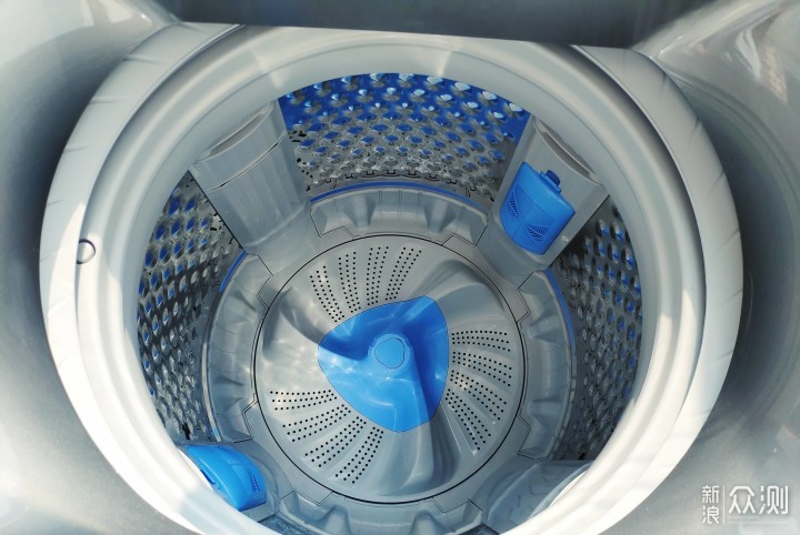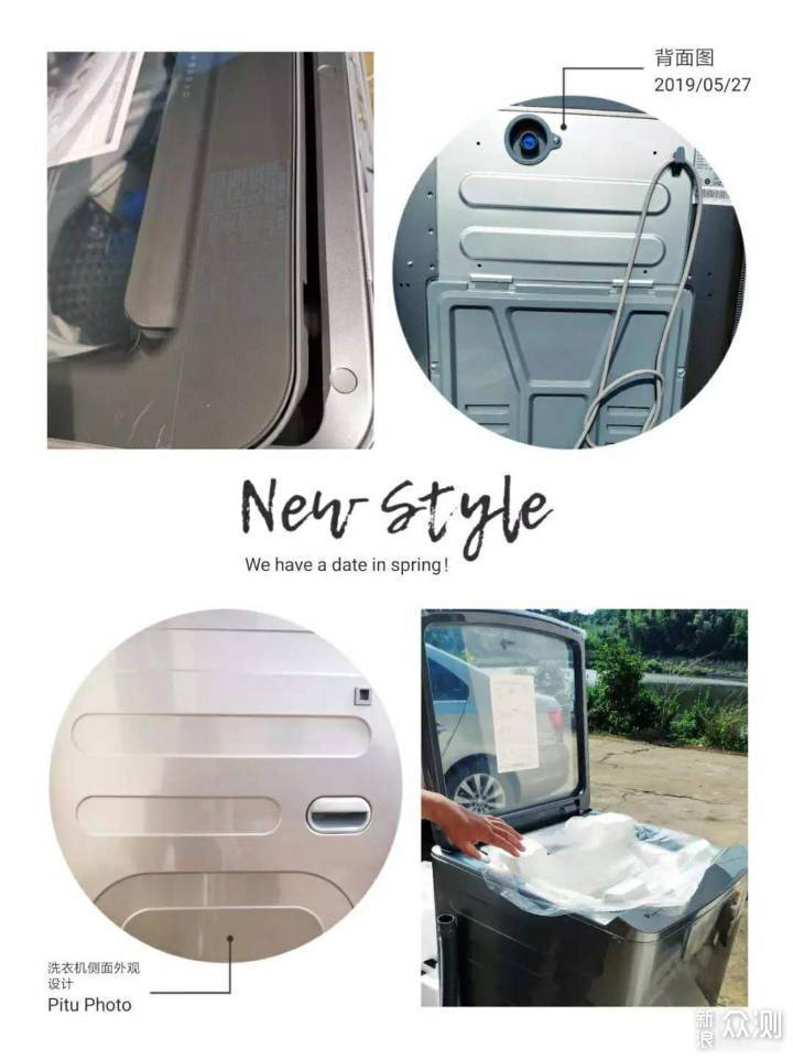 拆箱后,我们首先看下外观设计,第一眼很关键。 波轮洗衣机是翻盖设计,拥有透明全景视窗,可以清楚的看到洗衣机内部的结构。 侧面增加了许多凹槽设计,使侧面更加坚固也能减少共振所产生的噪音。 背面很清楚看到进水入口,电线的挂钩设计,整理看着还算舒适
