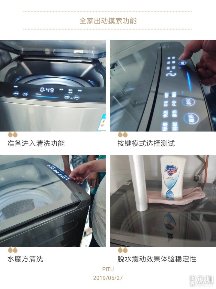 使用篇一清洗需要时间,当然也是考验技术的时候了,全家一起出动研究各种洗涤方式: 1,讨论水流排水,进水管入口在洗衣机背面,水流影响不大,不过在产品放置的时候浪费了空间,不能直接贴墙,排水是下排水方式,水管是在洗衣机下方,可以左右出水口自行设置,非常的人性化,多出的排水孔有一块挡鼠板,是不是非常贴心呢? 2,按键触屏操控,触屏隐藏了按键使得整个洗衣机面板清晰大方,表面看着只有简单的两个按键,实则内涵乾坤。 3,清洗程序和时间,尝试了水魔方清洗,标准清洗,浸泡洗,羊毛洗等不同洗衣方式时间都各有不同。在衣物的形状,清洁,颜色护理效果上非常突出。 4,护理效果,衣物清洗时用的是水魔方防缠绕功能,护衣效果良好。 5,中途添衣,中途添衣打开顶开式面板,清洗自动停止,带有提示音,添加衣物继续清洗。 6,儿童安全锁,开始清洗直接带有安全锁功能,功能按键直接锁定。 7,预约功能,预约功能感应及时,清洗正常。 8,测试脱水时的振动,脱水时没有发现振动噪音问题,脱水完美。 9,银离子杀菌技术这块说是在体验不出效果。 不过在使用过程中它的清洗还是有噪音的,不过让我惊喜的地方是脱水功能,全家猜测脱水时可能也会有噪音,并且准备了测试方式,首先是“沐浴露空瓶”测试,脱水时没有发现振动噪音问题,接着继续尝试体积小的保鲜袋测试,最终结果让全家人震惊,被征服了。通过多次尝试证明这款洗衣机洗涤去污快速,水魔方防缠绕良好,脱水无噪音,脱水稳定性非常好。