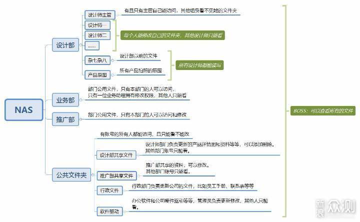 最基本的文件共享如何设置?先上一张当时做的权限分配示意图,比刚开始的需求增加了一个行政部门的公共文件夹,用来放员工手册、联系方式等行政部门需要分享的文件。