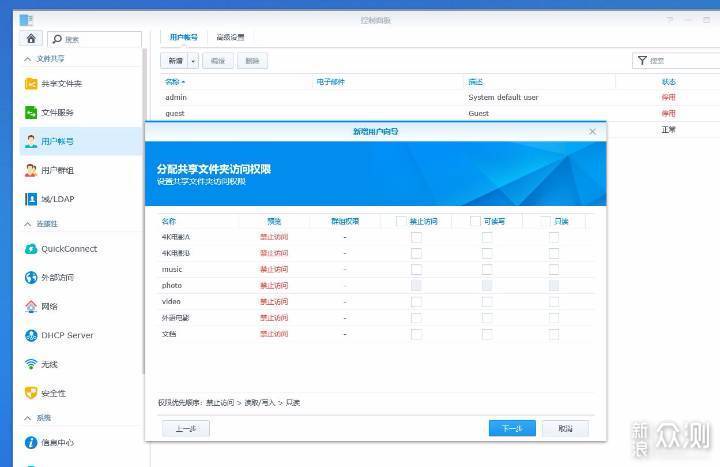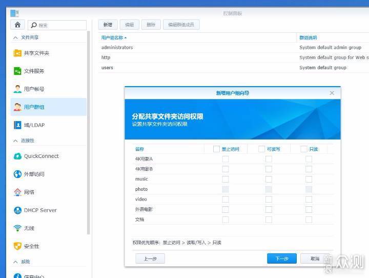 这里设置权限是需要交叉设置的,涉及到的就是“共享文件夹”、“用户账号”、“用户群组”。下面设置图片来自于我的DS918+。