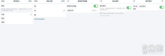 通过手机App可设置扫地机器人的清扫能力,最大可开启超强模式。还可通过手机App设置拖地用水量,并设置更换抹布的时间。