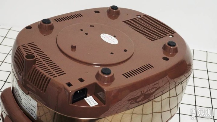 电源插头设计在底面及右侧面衔接位置,底面四周带有条形栏栅孔位辅助散热。透过底部散热孔位,可以窥视前置位内部有散热风扇,后置位内部电源连接线,以及环绕在底面的金色的电磁线圈条。底面采用螺丝加固,中心点四个支撑脚设计避震硅胶脚垫,末端位置有设计有柱状支撑杆。