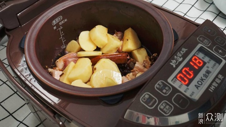 用电饭煲做红烧肉是个不错的选择,用洗净的五花肉块,搭配削皮切块的土豆,加上料酒、酱油、芝麻油、蒜头、姜片、冰糖、桂皮,八角等材料浸泡混合。金飙电饭煲蒸/炖模式默认只有15分钟,可以按“+/-”键进行适当调整。
