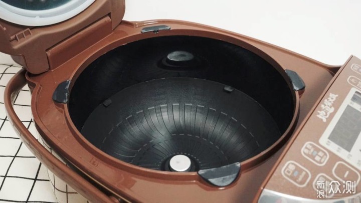 取出锅胆,可以看到锅体构造,被条形纹状的底面包裹着,直接延伸到锅胆中间。AOK金飚电饭锅采用IH电磁加热技术,这是整个电饭煲的核心部分。锅胆包裹在1300W功率电磁环绕,麦饭石内胆的受热更加均匀,同时又能够聚能锁热。IH电磁加热相比其他加热方式,除了温度更好控制,同时能使锅中米饭在蒸煮过程中,充分持续翻滚和对流。