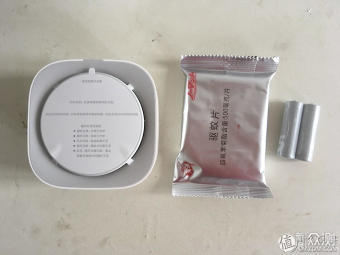 这是其中的一套:电池2节,驱蚊器一个,驱蚊片一个。电池是小米9.9元10节的那种普通电池。