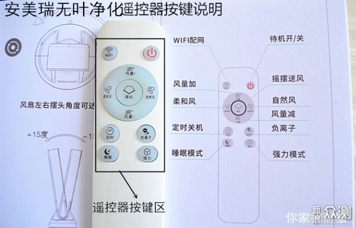两份检测报告和一份产品的说明书呈现给大家,检测报告由权威机构出具,有兴趣的朋友可以仔细翻看一下!这里要着重说的是安美瑞A8无叶净化风扇的操作使用说明书,安美瑞“清风共舞 自然相拥”的主题下,说明书排版思路一目了然,彩色的图文印刷清晰到位,印刷的纸质柔韧有力,彰显厂家和品牌的大气…… 乳白色的智能遥控器小巧超薄,手感极佳,按键上的文字清晰,可以支持10米范围内,在任何指向下对安美瑞A8进行操控,让忙碌的你有机会停下脚步偷个懒! 安美瑞A8的遥控器按键区共有11个按键,灵敏的按键可以从容的进行待机开关、风量增减、自然风、柔和风、负离子、强力模式、睡眠模式、定时关机、摇摆送风等操作。美中不足的就是“WIFI配网键”、“强力”、“睡眠模式”不能使用,这让招财猫还是有点小失望的,建议厂家后期进行功能的完善!
