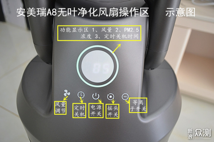 前面已经说过了,安美瑞A8无叶净化风扇拥有手动按键/智能遥控两种方式操作,这里咱们看一下安美瑞A8的主机操控面板。 安美瑞A8的多功能显示区采用隐藏式、一体化设计,显得很高大上。打开电源开关氛围灯亮起后会有多功能按键和指示灯显示。氛围灯下面自左到右依次为风量调节、定时关机、电源开关、摇头开关、等离子开关键五大主要功能键组成,日常使用,没有遥控器的情况下,通过这几组按键也可以轻松地对风扇进行各项操控。
