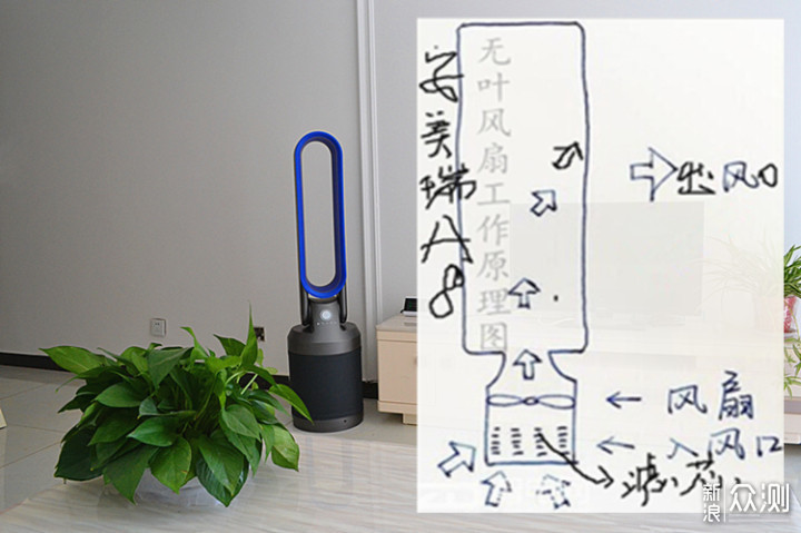 说到主打卖点风速风量和空净功能,招财猫给大家画了一幅安美瑞A8无叶空净风扇工作原理图,通过图解大家会对无叶空净风扇这一未来主流的风扇设计有更加深刻的印象。 安美瑞A8的风速、风量到底是怎么样的呢?用过安美瑞无叶净化风扇最大的感受就是风力柔和且稳定,非常接近自然风。之所以这样,上文已经对A8的旋风式风轮及出风口结构设计做过说明,大家不明白的可以在翻看一下!