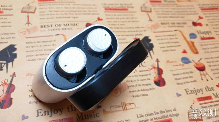 掀开盒子的正面,第一眼就能看全耳机及耳机仓的全貌,别致的耳机仓造型、黑色的耳机仓盒盖、两枚小巧的蓝牙耳机便是第一印象。