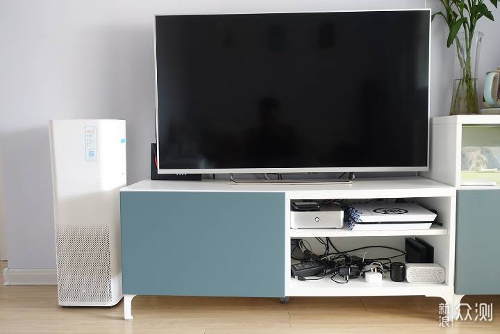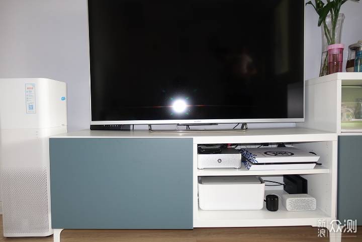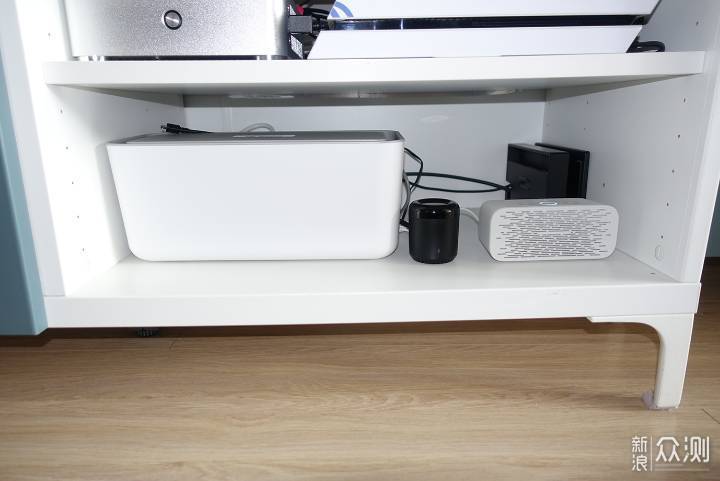 以上这些设备,如果想通过装修的时候预留插座的话,估计墙上满排都是插座了。现在,我通过收纳盒加排插的方式,既解决了插座数量不足,又可以尽可能做到美观得体。由于网易智选收纳盒三面都可以走线,所以即使是这么多插座和电线进出也毫无压力。虽然收纳盒里面各种插座和电线相互交织显得十分凌乱。但是盒子盖上后,就都隐藏到收纳盒里面了。 我家的电视柜有两层,而且可以通过隔板来调整每一层的层高占比。第一层已经放满了PS4、HTPC和移动魔百盒。通过调整层高,第二层高刚好可以用来放置排插收纳盒。接下来,将各种电线插座收纳进盒子里去。虽然收纳盒的空间足够大,但是毕竟要放进去的电线和插座数量实在比较多,有些个头还比较大。所以,插座在收纳盒里面也要合理的排布和分配,才能充分利用空间。