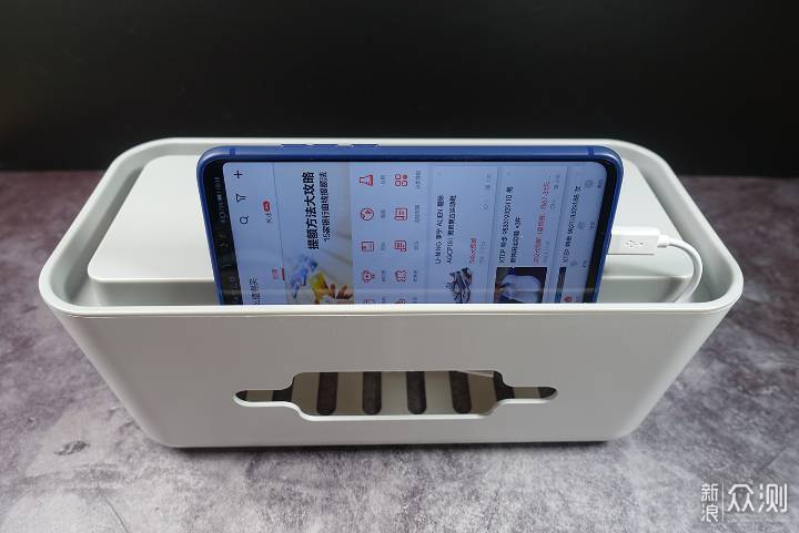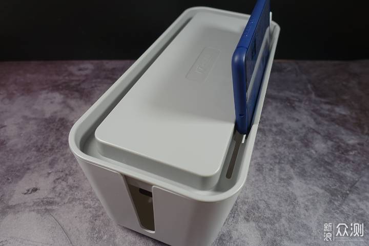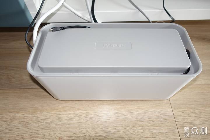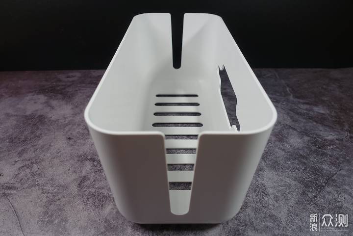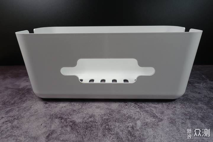 盒身的两侧都留有开口,方便线材的进出。除此之外,盒身的背部也留有可供插头进入的开孔,而且空洞面积足够大。这样,收纳盒的三面都可以让线材或插头进出。相比斐讯TC1只能从背部进入插头要方便不少。