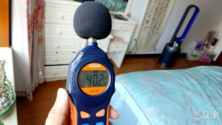 距离出风口4米,测量噪音为40.2分贝。安美瑞无叶风扇使用了直流无刷电机配合离心风轮的设计,很好的控制工作时的噪音。一般情况下,我们在使用时不会离出风口如此之近,所以这第一次测量情况根本不会出现。而2-4米的距离比较符合实际生活中所用的距离,这个音量大大低于正常谈话的音量。