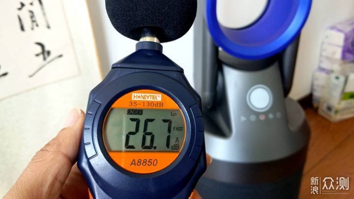 做为一款实用的家用电气来说,静音效果是决定产品优劣的重要因素,如果噪音过大,必然会影响孩子和老人的睡眠质量。下面我就通过专业噪音仪来测量一下安美瑞无叶风扇的噪音情况。先测量一下室内正常噪音情况26.7,然后开启风扇。