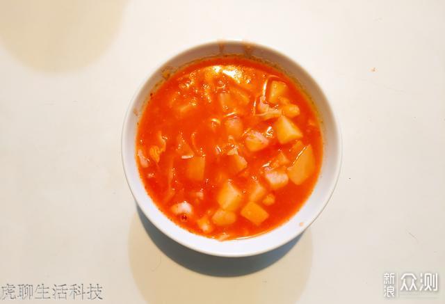 做好的西红柿汁,还是看上去不错的,这个不是为了生吃,是做汤。用土豆块,包菜片,加上刚才的西瓜红汁,做了个汤,看上去有没有罗宋汤的感觉?吃起来,也同直接把西红柿放进去不同的,西红柿打了之后,做出来的汤,感觉更加有味道。