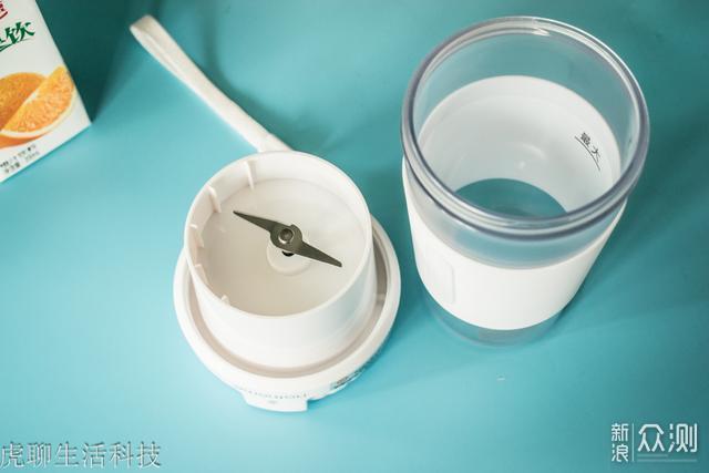 将榨汁机的盖子拧下来,发现刀头就藏在盖子里面,而其余的部分,就是一个杯子。杯盖的一侧有腕带,方便携带。刀头是2片的。