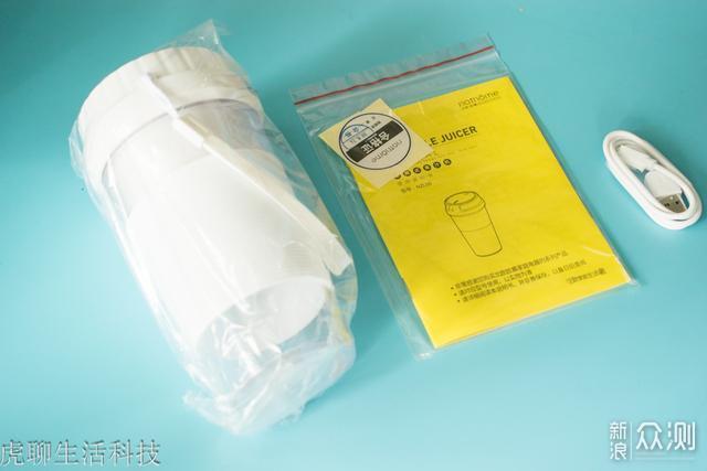 取出来,有塑料袋包裹的榨汁机,黄色的说明书,合格证,以及一根充电线。
