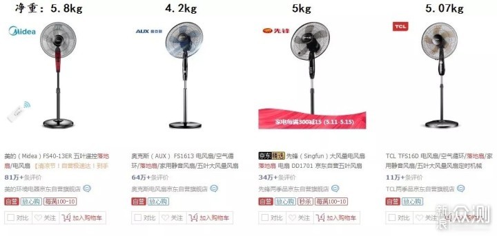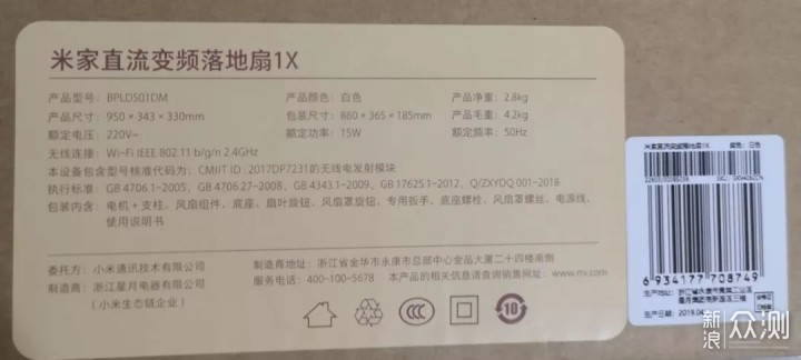 包装箱侧面的产品铭牌标签,有两个比较亮眼的参数。净重:2.8KG,额定功率15W。 我们来比较一下市面上主流的几款落地扇。