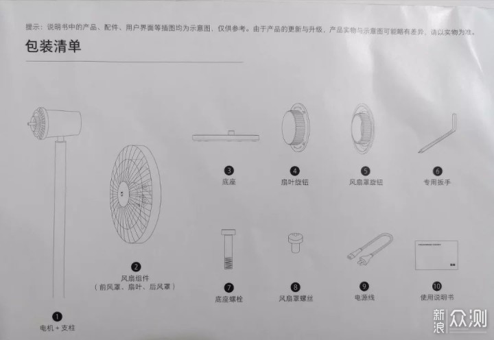 包装清单,简易明了。这是唯一一台在没有我指导的前提下由女王大人(动手能力几乎为零)亲手组装完成的落地扇,在我下班回家之前她已经装好并得意洋洋的跟我耀武扬威了。 得益于两点,一是产品的设计充分的考虑了用户的人性化拆装问题。二是产品的示意图和标识都非常简单清楚。简单来说就是无脑拼积木,2颗螺钉,2个旋钮,成品就出来了。