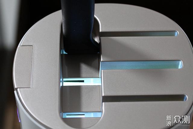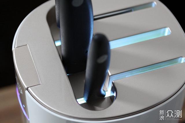 工作的时候刀架底部有肉眼可见的紫外光,缝隙是为了烘干时的透气,同时底座也是一个沥水盘,可以定期拆卸下来做清理,确保刀立净刀具本身的干净卫生。