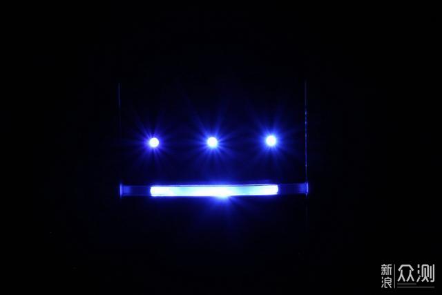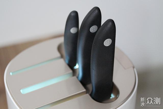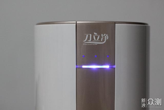 上面三个LED指示灯代表了三个刀具的工作情况,亮灯代表消毒工作进行中。下部的电源指示灯是一个长条状的蓝紫色的,除了作为电源通电的指示灯之外,在弱光环境下也能起到不错的一种装饰作用。