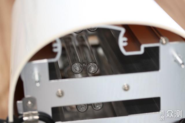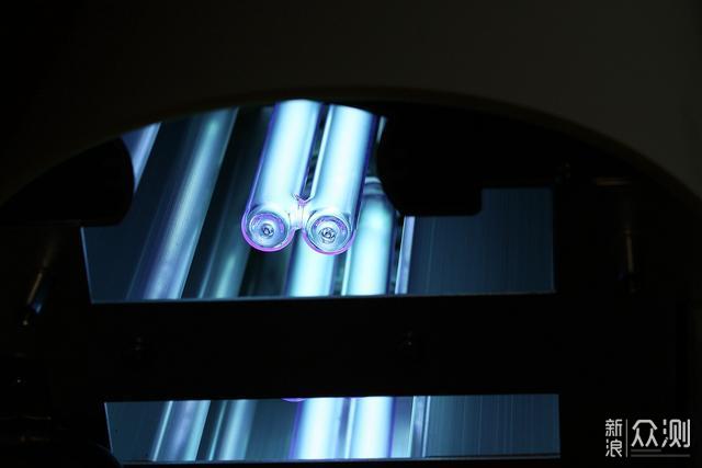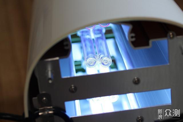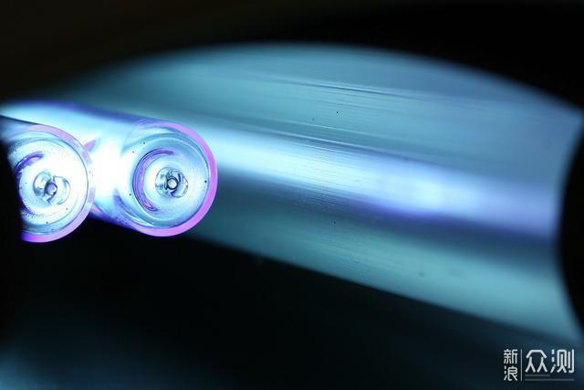 紫外线灯的工作情况,灯亮起来的时候还是很漂亮的,不过人体可不适合被紫外线长期照射啊,长期紫外线照射对人体健康有一定的危害。如果紫外线能量大又没有防护措施,极易对人体造成巨大伤害。裸露的肌肤被紫外线灯照射轻者会出现红肿、疼痒、脱屑等;严重者甚至会引发癌变、皮肤肿瘤等。紫外线不能对着眼睛无防护照射,可能会引起结膜、角膜发炎,长期照射可能会导致白内障。说到这里笔者在测试的时候因为为了更好的评测拆掉底座进行测试,本来以为很短的时间应该没事,结果导致眼睛疼痛难忍了好一段时间,这个大家要注意了是错误示范!!