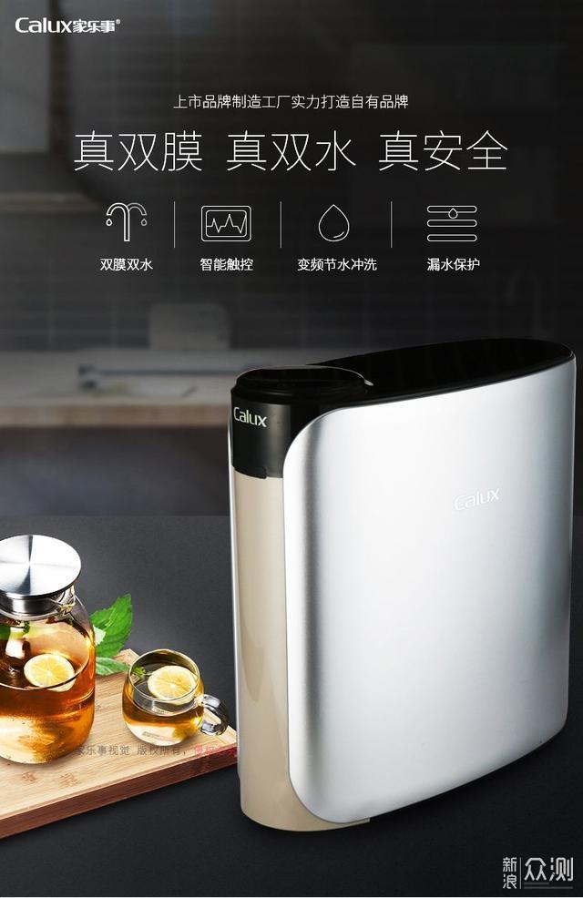 因为预算有限,所以性价比是我关注的重点!我筛选了3千以下的几个品牌和型号,但是比来比去,有双出水功能的还真是没几个,有些还是假双出水,宣传的是双出水,但是一看参数,只有一个RO膜没有超滤膜,那这种就不是真的双出水,不懂的小白肯定会上当,真是防不胜防啊! 4.外观和售后 这个机子整个流线型曲面,银色磨砂肤感,拉丝银高档标贴,隐形浮雕防伪,抚之爱不释手,放在厨房确实感觉很高档,绝对算得上高大上! 关于售后,商家也承诺三年质保,90天包退换,全国免人工费上门安装,那这个确实也就让我比较放心了! 小结: 根据以上的几个选购条件,我最终确定选择了这款双出水的纯水机,接下来我就简单说说我的使用感受。 二、使用测评:机器品牌:Calux家乐事 机器型号:CL-DR-B306 开箱:
