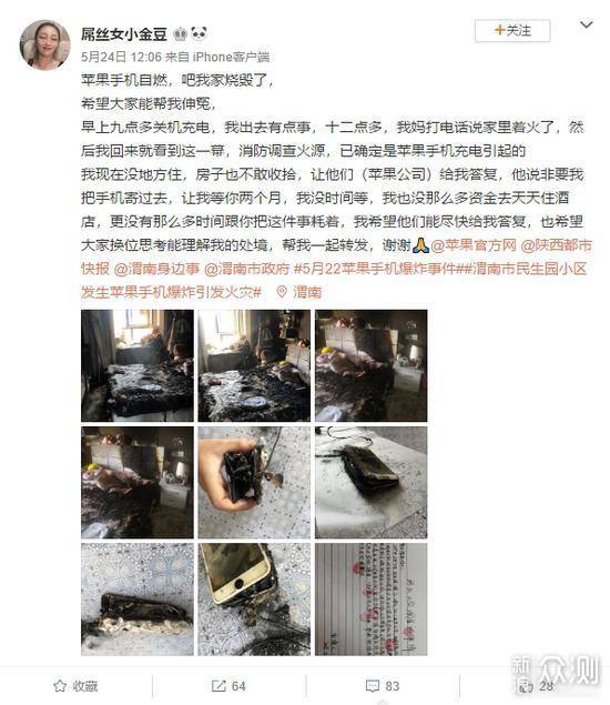 3、 微博用户控诉iPhone起火烧毁居室 或因充电引起事故 近日,微博用户@屌丝女小金豆 在微博控诉苹果手机自燃“把我家烧毁了”,并放出了现场图片佐证,希望苹果尽快给一个说法。当事人表示:“早上九点多关机充电,我出去有点事,十二点多,我妈打电话说家里着火了,然后我回来就看到这一幕,消防调查火源,已确定是苹果手机充电引起的。”从现场图上看,当事人房屋内床铺已经面目全非,墙壁也几乎全部被熏黑,看起来起火区域主要集中在主卧房间内。同时已经被烧焦的iPhone依然还连着数据线,而电池因受热起火撑开了机身背板。当事人并不满意苹果公司的回复:“让他们(苹果公司)给我答复,他说非要我把手机寄过去,让我等你两个月,我没时间等,我也没那么多资金去天天住酒店,更没有那么多时间跟你把这件事耗着,我希望他们能尽快给我答复。”目前尚未有其他权威信息源证实此事,苹果官方也未回复,事件真实性有待验证。不过此前曾发生过因使用第三方苹果充电器导致的起火或漏电的事故,各位苹果手机用户还是尽量用符合MFI认证的充电设备充电以保证安全。