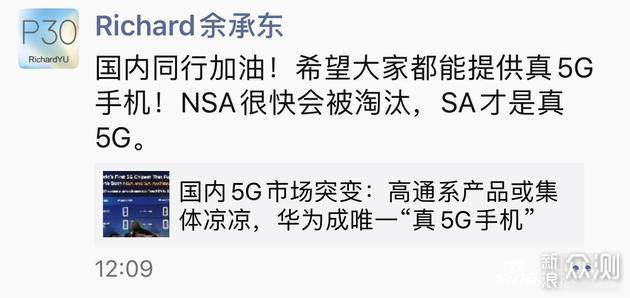 余承东:NSA组网很快淘汰 希望友商都能提供真5G手机 6月27日下午消息,华为消费者业务总裁余承东在微信转发《国内5G市场突变:高通系产品或集体凉凉,华为成唯一“真5G手机”》一文时表示,5G时代NSA(非独立组网)很快会被淘汰,SA(独立组网)才是真5G。余承东提及的NSA和SA是5G网络到来前,两种不同的组网方式:NSA代表非独立组网,是在原有4G核心网基础上进行升级改造,属于4G、5G融合组网;而SA代表独立组网,需要建立新的5G核心网,成本更高但效果更好。故而SA组网被看作是真正的5G网络。目前,5G移动基带芯片中,高通骁龙X50仅支持NSA组网模式,而华为巴龙5000芯片和联发科技Helio M70同时支持NSA组网和SA组网。这意味着,首批搭载高通骁龙855处理器和X50调制解调器的5G手机仅可在NSA组网模式下工作。此前,中国移动董事长杨杰在GTI2019峰会上表示,明年1月1日开始5G终端必须具备SA模式,这意味着明年NSA手机不可入网。这也是余承东提及华为“真5G手机”的原因。