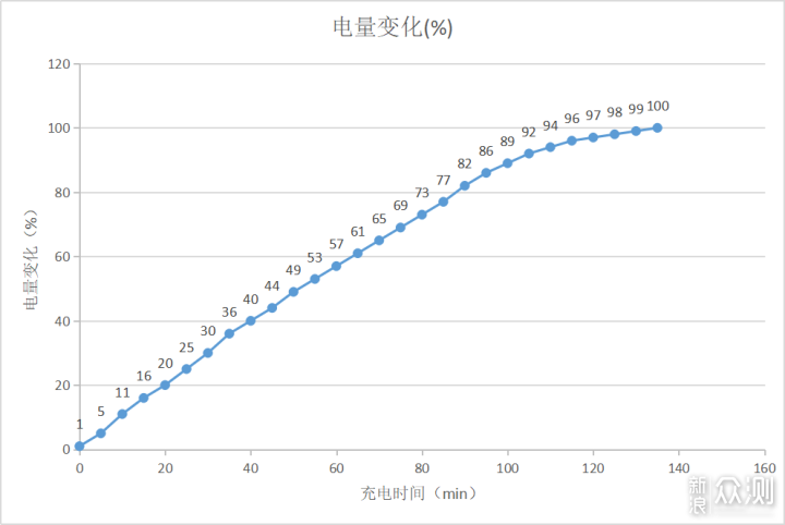 18W快充,可反向充电根据小学弟实际测试,从手机电量为1%时开始充电,每5分钟记录一次电量,作成折线图,如下图所示。​