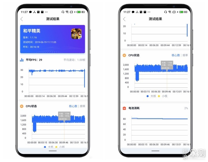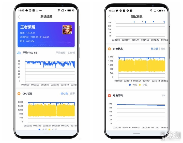 ​《王者荣耀》最高画质下,基本维持在57fps-60fps之间,大规模团战情况下则基本保持在55-60fps,偶尔有几个画面突然降至50帧左右的情况发生,整体表现中规中矩。但是,不知道是否是测试机的原因,魅族16Xs发热严重,几局下屏幕局部温度都升高到40度以上。按理说,骁龙675作为低功耗Soc,不会发生这样的问题,网络上也没有发热异常的反馈。当然骁龙675无论如何都无法达到旗舰骁龙855的水准。于是我拿左侧的16th骁龙845与16Xs做比较,结果是令人意外的。