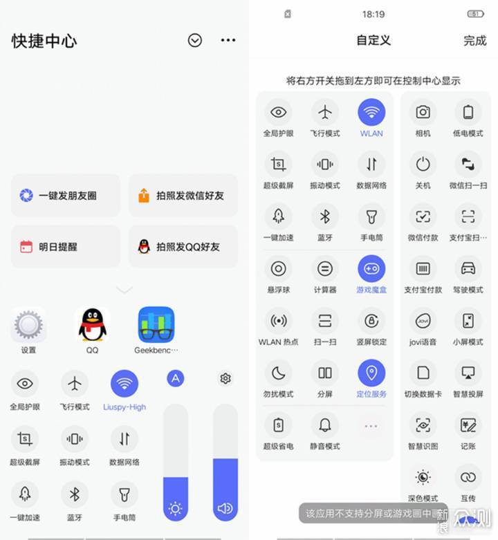 ▼屏幕左下方上滑能够唤出快捷中心,可以自定义非常丰富的功能。