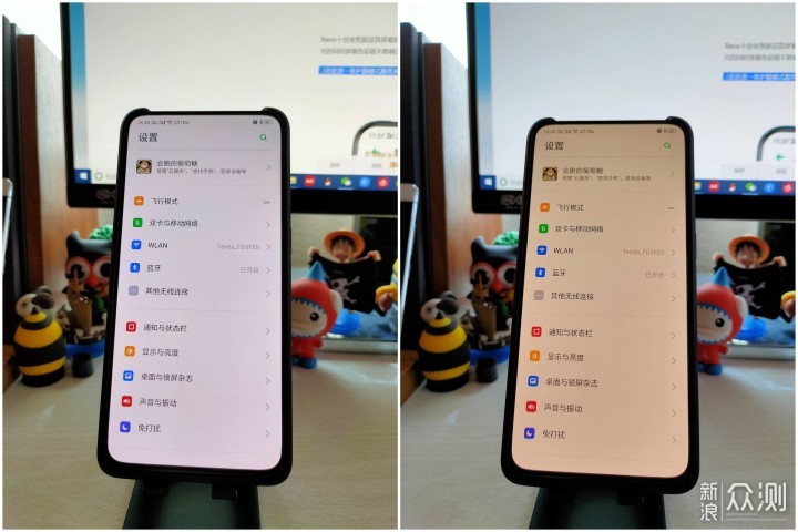 色彩方面,OPPO Reno的屏幕覆盖了P3色域,色彩显示艳丽,另外还支持调成sRGB模式,色彩会稍微暗淡一些。我们来对比一下Reno的AMOLED屏和荣耀V20的LCD屏。