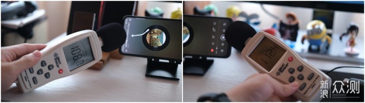 ▲播放一段音乐,从0-30s,记录两个扬声器的最大分贝,能看得出来底部的扬声器声音会稍微大一点点,但是两个声音相差不大,最大音量均能达到100分贝以上(贴近测量数据)。
