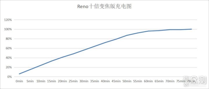 我是从6%开始充电的,总共花了78分钟,从数据估计0-100%的充电时间为80分钟。半小时能充50%的电。从0-前95%几乎都是以每分钟1.6%-2%的速度往里面充电,95%电量后开始涓流充电,最后5%的电量充了约20分钟。
