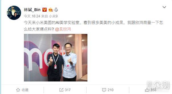 1、 小米美图AI美学实验室成立 美图CEO吴欣鸿一同加入 刚刚小米林斌通过微博公布,小米成立美图AI美学试验室,美图创始人吴欣鸿一同加入。去年11月19日小米与美图宣布签订战略合作协议,美图将旗下美图手机的品牌、影像技术和二级域名,在全球范围内独家授权给小米集团。授权之后的美图手机将由小米负责研发、生产、销售和推广;而美图公司将持续提供影像技术与美颜算法的共同支持。今年上半年美图发布告别信将关闭手机业务,小米后续接受美图手机业务。这条微博,进一步说明美图手机正式归为小米名下开始发展。值得关注的是,美图CEO吴欣鸿也加入到美图AI美学试验室中。小米的首款美图手机可能就要来了。小米的工艺+美图的AI美颜技术,是不是很期待呢?
